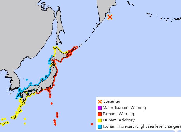 Potrivit alertei emise de Agenția Meteorologică Japoneză (JMA), există risc de tsunami în mai multe regiuni de pe coasta de est a Japoniei: Hokkaido, Tohoku, Kanto (inclusiv Tokyo), insulele Izu și Ogasawara, regiunea Tokai și prefectura Wakayama.