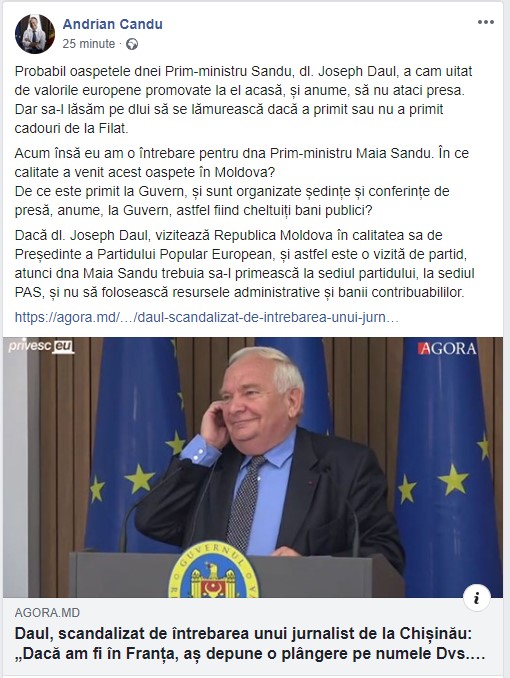 Fostul președinte al Parlamentului, deputatul din fracțiunea Partidului Democrat din Moldova, Andrian Candu a venit cu o întrebare pentru prim-ministrul Maia Sandu. Acesta se întreabă, în calitate de ce a venit Daul la Chișinău? El fiind simplu președinte de partid și nu are o funcție la nivel de Uniunea Europeană, fiind doar președintele partidului PPE, sub custodia căruia se află și partidele din blocul ACUM.