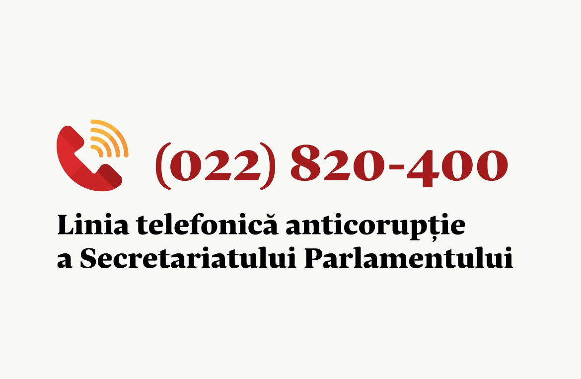 Secretariatul Parlamentului a instituit o linie telefonică specializată anticorupție. Persoanele care dețin informații despre eventuale fapte de corupție comise de către angajații Secretariatului Parlamentului le vor putea comunica apelând numărul de telefon 022 820 400.