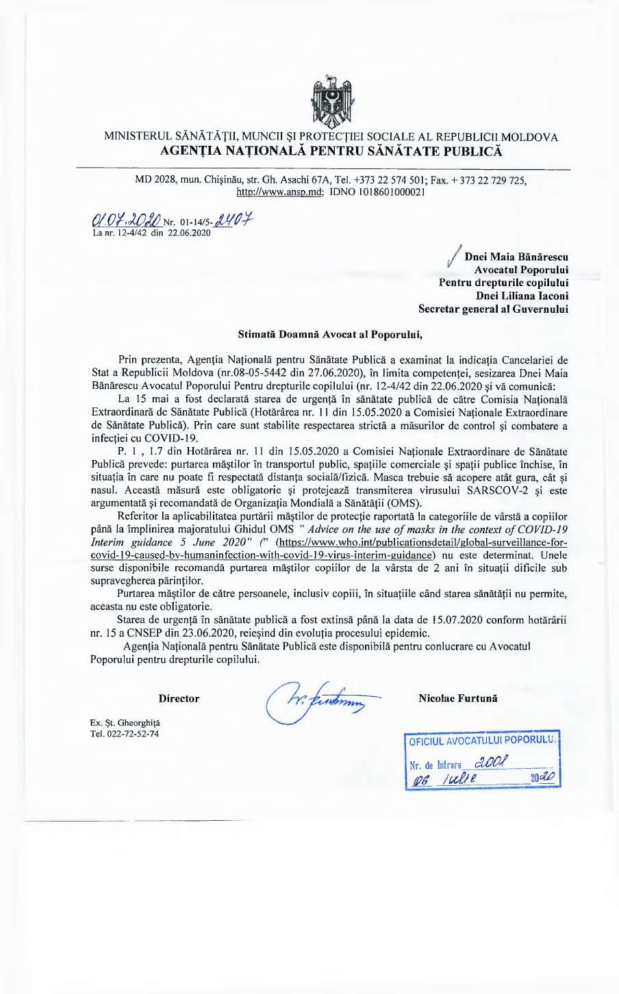 În răspunsul expediat Ombudsmanului Copilului de către directorul Agenției de Sănătate Publică, Nicolae Furtună, se spune că Ghidul OMS „Advice on the use of masks in the context of COVID-19 Interim guidance 5 June 2020” nu stabilește foarte clar aplicabilitatea purtării măștilor de protecție raportată la categoriile de vârstă a copiilor până la împlinirea majoratului.
