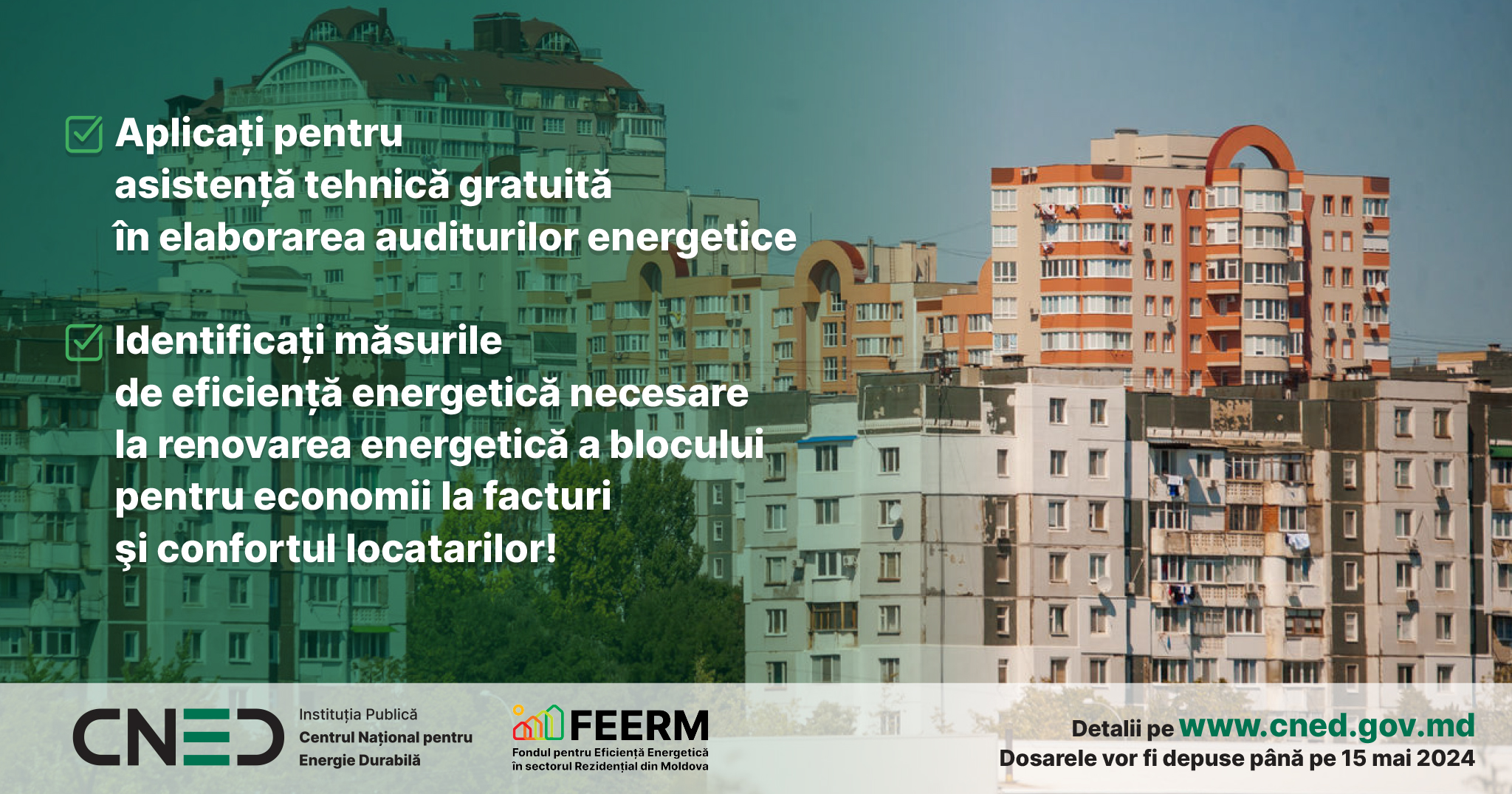 Centrul Național pentru Energie Durabilă (CNED) anunță lansarea unui nou apel de identificare a Asociațiilor de locatari care vor beneficia de asistență tehnică gratuită la elaborarea auditurilor energetice, care vor sta la baza proiectelor de reabilitare energetică a blocurilor locative.