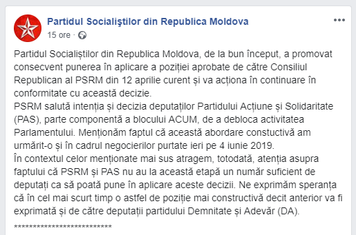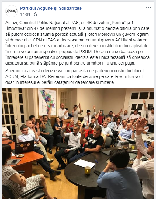 Remarcăm că după anunțarea poziției PAS, Partidul Socialiștilor a saluat hotărârea luată de partidul condus de Maia Sandu. Astfel, în premieră pentru Republica Moldova, suntem în pragul formării unei guvernări dintre un partid așa-zis pro-european și un partid pro-rus. (Vedeți mai jos cum s-au succedat evenimentele de ieri)