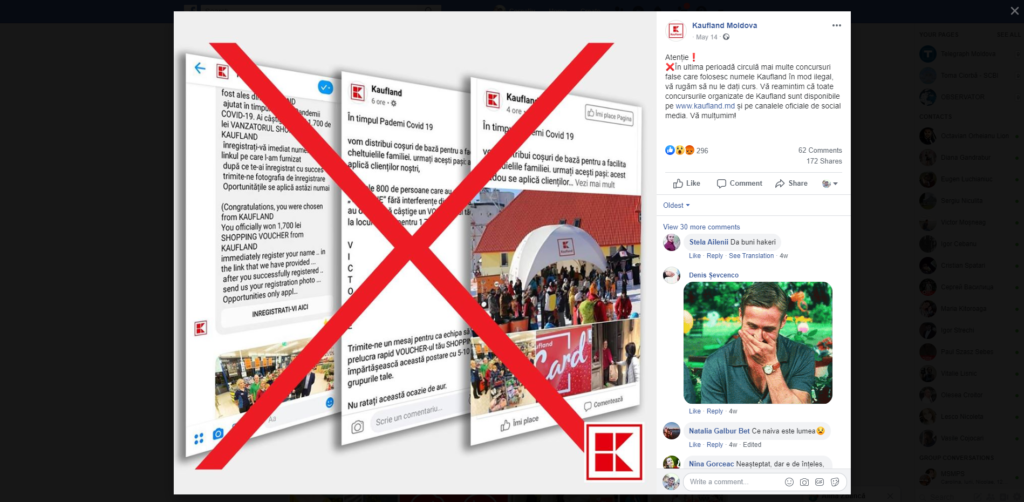 Menționăm că astfel de pagini au fost create și în numele Kaufland Moldova și Petrom. Potrivit acestor companii, paginile lor au fost clonate, iar persoane necunoscute promiteau bani, apoi solicitau datele cardurilor bancare ale persoanelor care picau în capcană.