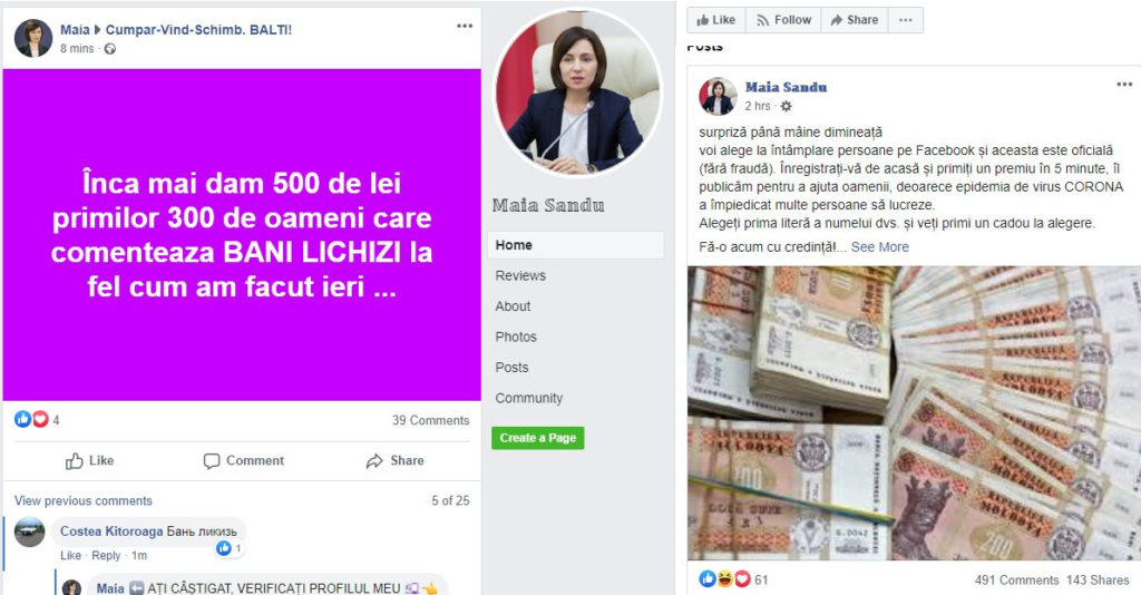 ”Mai multe pagini false distribuie în numele meu mesaje mincinoase în legătură cu un concurs la care chipurile s-ar da bani câștigătorilor. Este un fals! Singura pagină unde comunic cu dumneavoastră este Maia Sandu, care are un cerculeț albastru în dreptul ei.