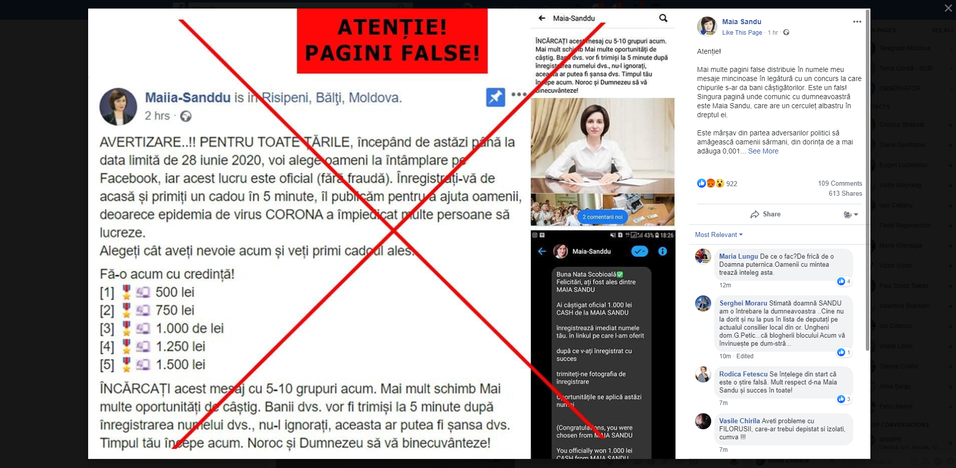 ”Mai multe pagini false distribuie în numele meu mesaje mincinoase în legătură cu un concurs la care chipurile s-ar da bani câștigătorilor. Este un fals! Singura pagină unde comunic cu dumneavoastră este Maia Sandu, care are un cerculeț albastru în dreptul ei.