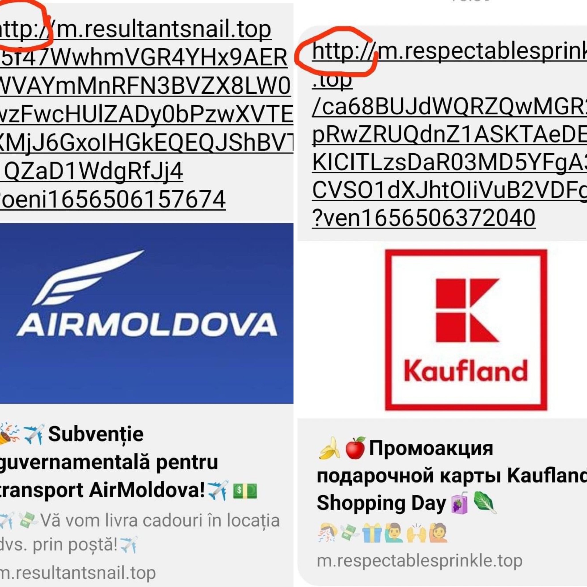 STISC vă atenționează că în perioada curentă, în mediul online este distribuită intens o tentativă de #phishing de tip mesaje prin Messenger, în care utilizatorii sunt ademeniți să acceseze link-uri false sub pretextul de a beneficia de card promoțional la Kaufland și/sau premii bănești de la Air Moldova.