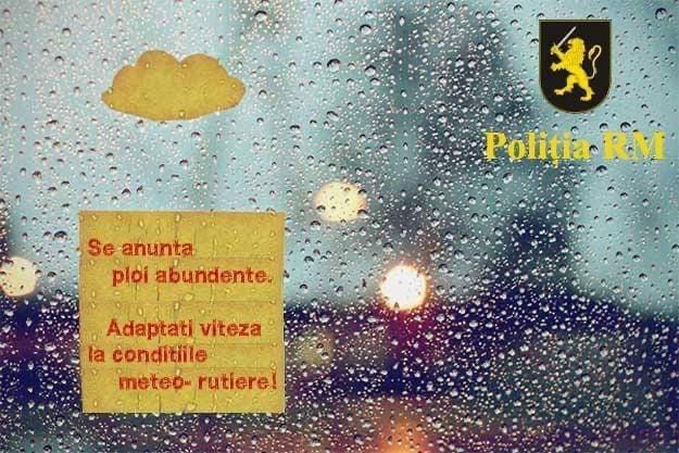La aceasta oră, se circulă în condiții de ploaie, suprafața carosabilă este umedă și alunecoasă, iar neadaptarea vitezei la condițiile meteo-rutiere, crește riscul producerii de accidente rutiere.