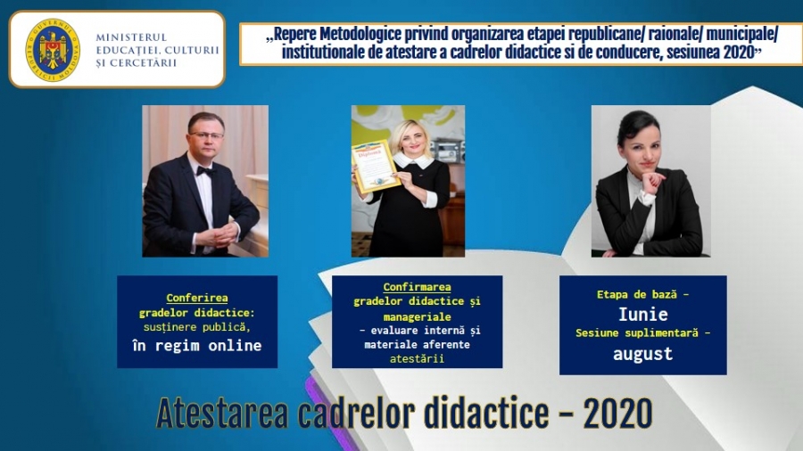Ministerul Educației, Culturii și Cercetării a elaborat și aprobat documentul „Reperele metodologice de organizare și desfășurare a etapei republicane/ raionale/municipale/ instituționale de atestare a cadrelor didactice și de conducere, sesiunea 2020”, transmite Telegraph.md