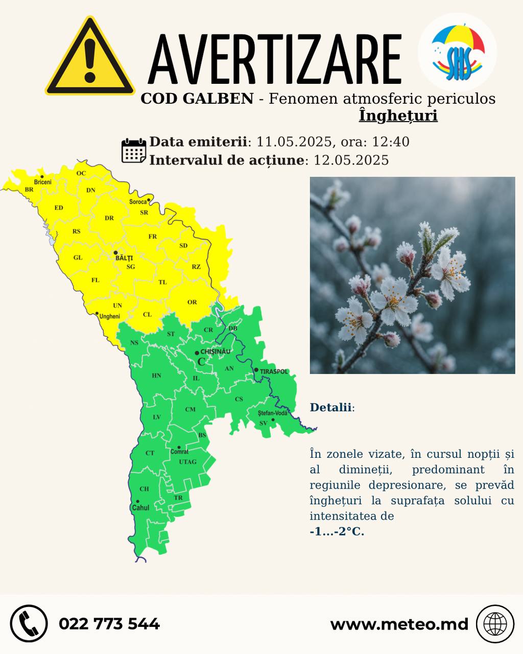 Serviciul Hidrometeorologic de Stat a emis o avertizare Cod Galben pentru fenomen meteorologic periculos – înghețuri – valabilă în data de 12 mai 2025.