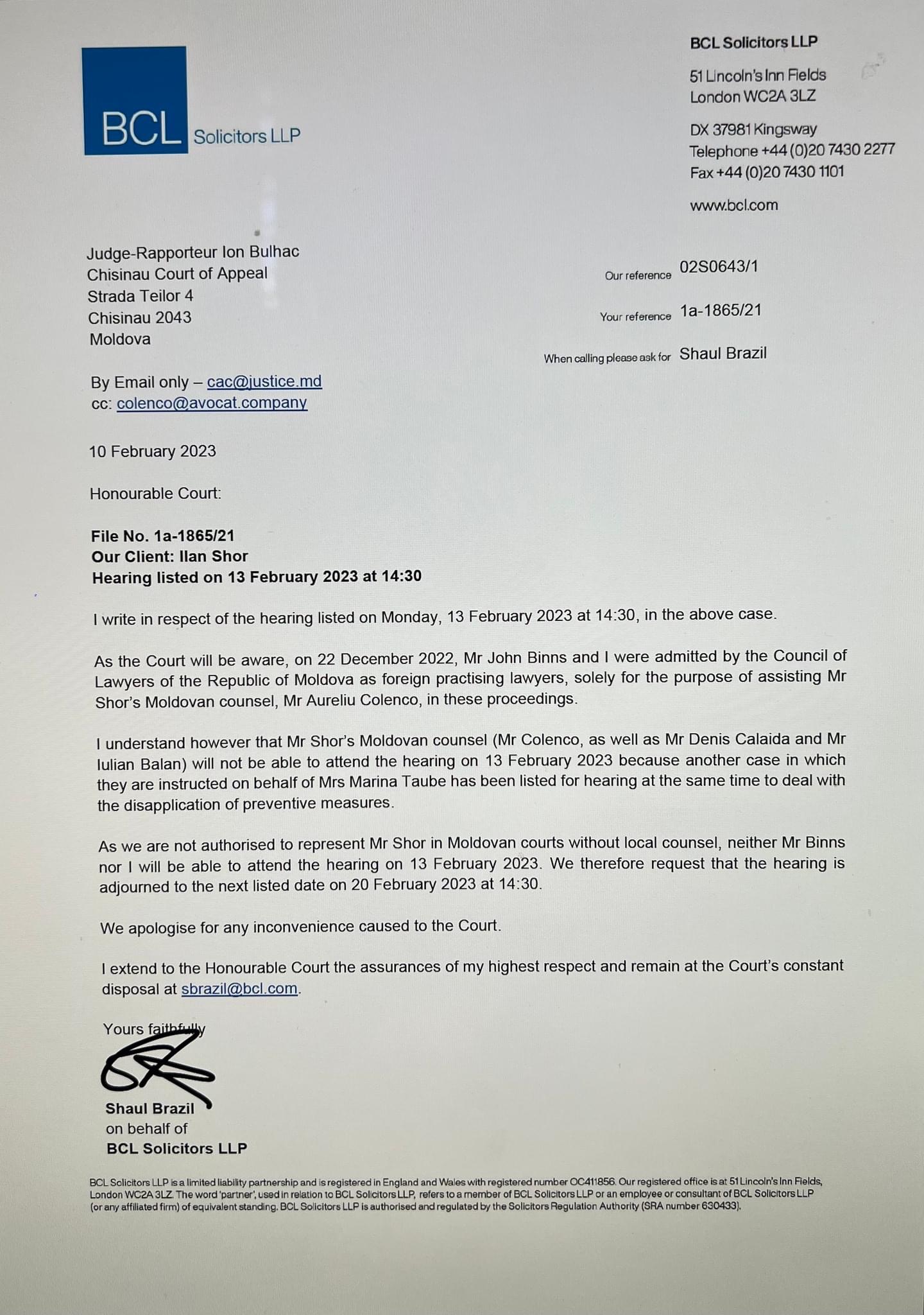 Potrivit lui Aureliu Colenco, tot pentru astăzi, la aceeași oră, a fost stabilită o altă cauză privind revocarea aplicării măsurii preventive a unui alt client. „Ținând cont de faptul că, prioritar, sunt examinate cauzele privind aplicarea măsurilor cu caracter de constrângere, nu vom fi disponibili de a fi prezenți la ședința numită pe azi. Totodată, următoarea ședința pe cauza este numită pentru data de 20 februarie 2023. În acest sens, informarea privind indisponibilitatea prezentării le-a fost remisă deja magistraților de la Curtea de Apel, care examinează cauza, și de către colegul nostru din Marea Britanie, avocatul Shaul Brazil. El nu este autorizat să îl reprezinte pe domnul Ilan Șor în instanțele din Moldova, fără a fi asistat de avocat local”, a explicat avocatul Aureliu Colenco.