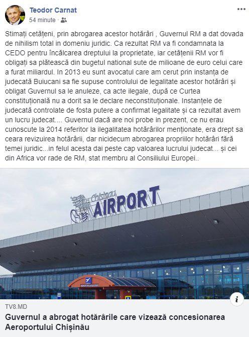 Prin abrogarea celor 4 hotărâri de guvern prinvind concesionarea Aeroportului Internațional Chișinău, Guvernul condus de Maia Samdu a dat dovadă de nihilism total în domeniu juridic. Declarația a fost făcută de avocatul Teodor Cârnaț pe pagina sa de facebook.