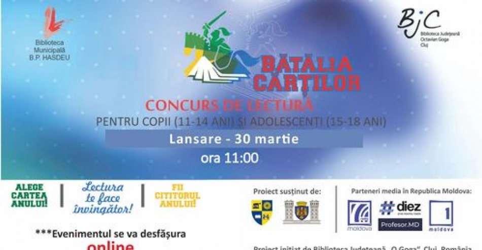 Marți, 30 martie 2021, ora 11:00, Biblioteca Municipală „B.P. Hașdeu” organizează lansarea Concursului de lectură „Bătălia cărților”, ediția a VII-a, realizat în parteneriat cu Biblioteca Județeană „Octavian Goga” din Cluj-Napoca, România.