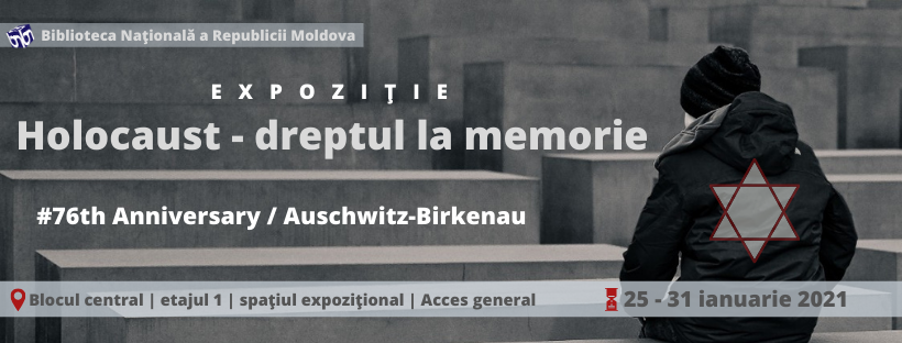 Biblioteca Națională a Republicii Moldova vă invită să vizitați expoziția de carte tematică „ Holocaustul – dreptul la memorie”, care conține circa 70 de documente din colecțiile bibliotecii. Scopul expoziției: Promovarea și valorificarea documentelor cu conținut științific și didactic despre soarta evreilor de pretutindeni.
