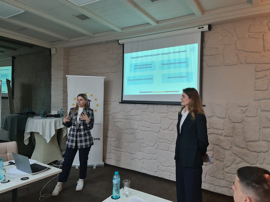 Prin prezentări interactive, colegele de la BIE, Valeia Bîcu și Ludmila-Drăgălina Vrâncenu, consultante principale în cadrul Diecției de coordonare a procesului de aderare, au adus în discuție aspectele-cheie privind activitățile, rolul și prioritățile Biroului în parcursul de eurointegrare a Republicii Moldova.