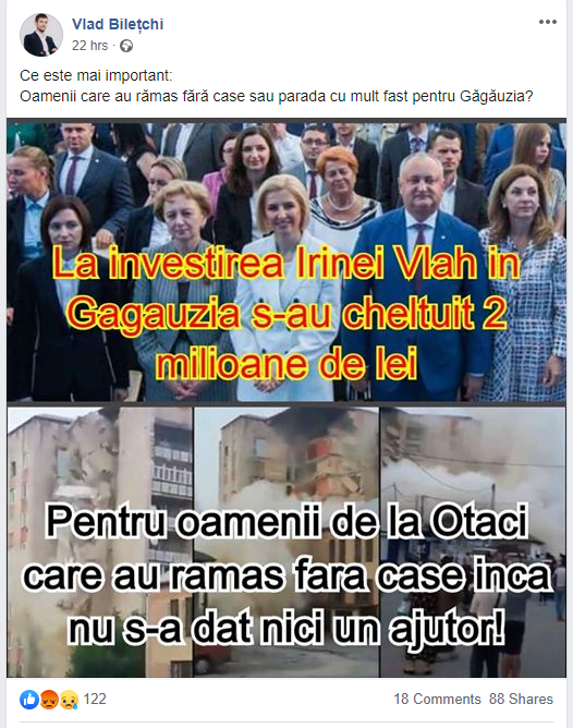 Activistul civic Vlad Bilețchi a postat un colaj pe facebook prin care atrage atenția opiniei publice că la învestirea bașcanului Găgăuziei Irinei Vlah s-au găsit bani, între timp însă oamenii din Otaci rămași fără case cu o lună în urmă încă n-au primit nici-un ajutor din partea statului. De această situație s-ar face vinovați președintele Igor Ddoon și premierul Maia Sandu, dar și deputații PSRM-ACUM are dețin puterea, consideră internauții.