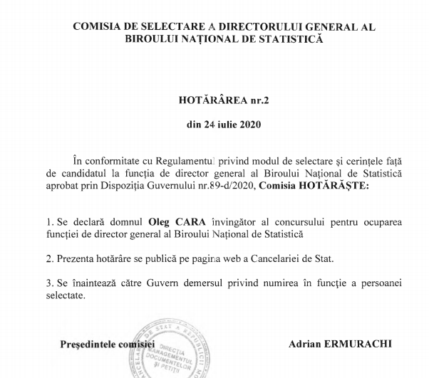 Oleg Cara a fost desemnat câștigător al concursului de către Comisia de selectare în urma etapei interviului, care s-a desfășurat la 24 iulie.