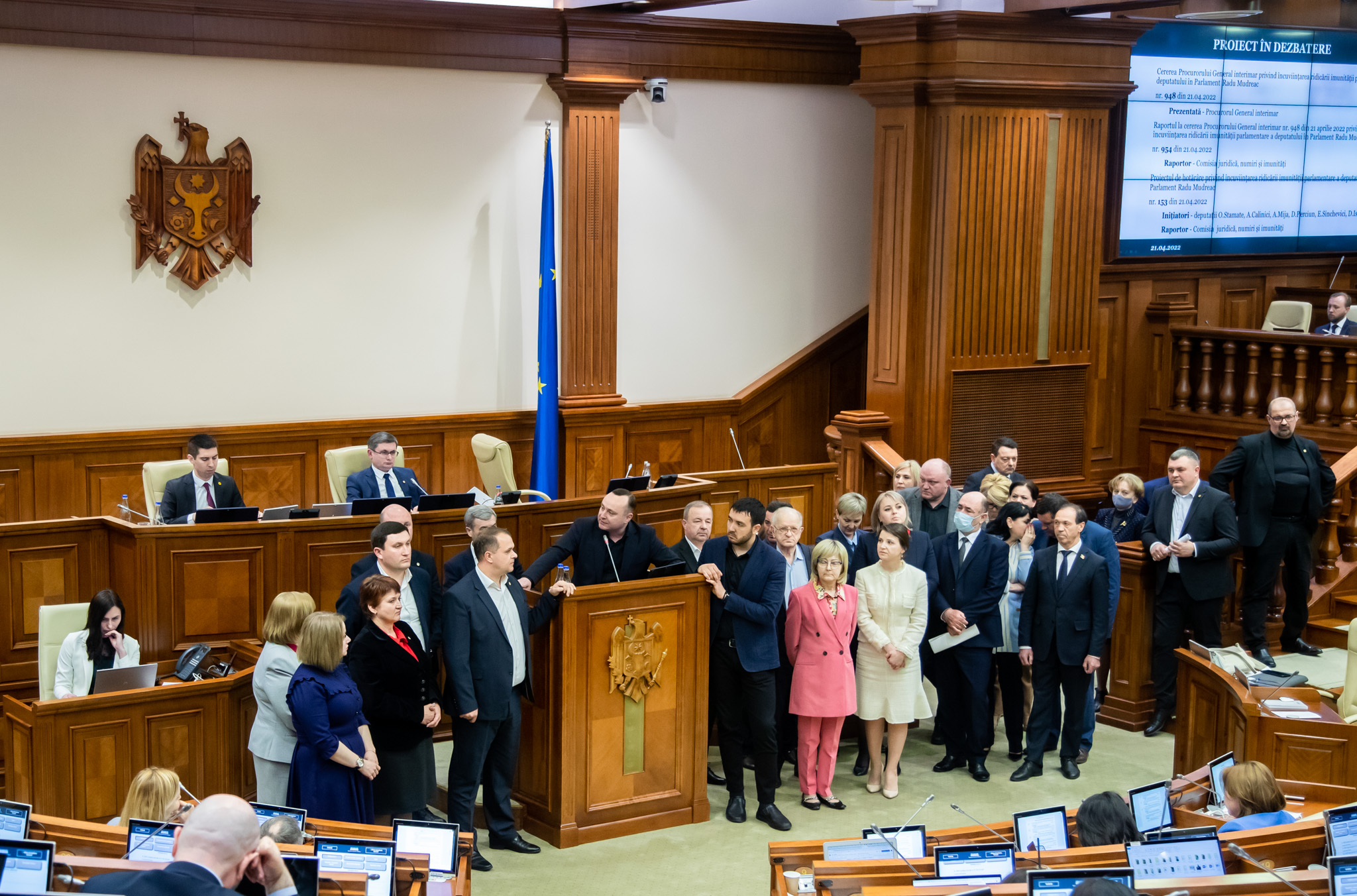 Fracțiunea Blocului Comuniștilor și Socialiștilor a blocat tribuna Parlamentului, în timp ce majoritatea PAS vota ridicarea imunității socialistului Radu Mudreac. „Rușine!”, au scandat deputații BCS. Vicepreședintele Parlamentului, Vlad Batrîncea, a declarat că tot azi, la sediul PSRM din capitală stau ofițerii SIS și monitorizează situația. „Scopul nu era dosar, scopul era acest show!”, a mai spus Batrîncea.