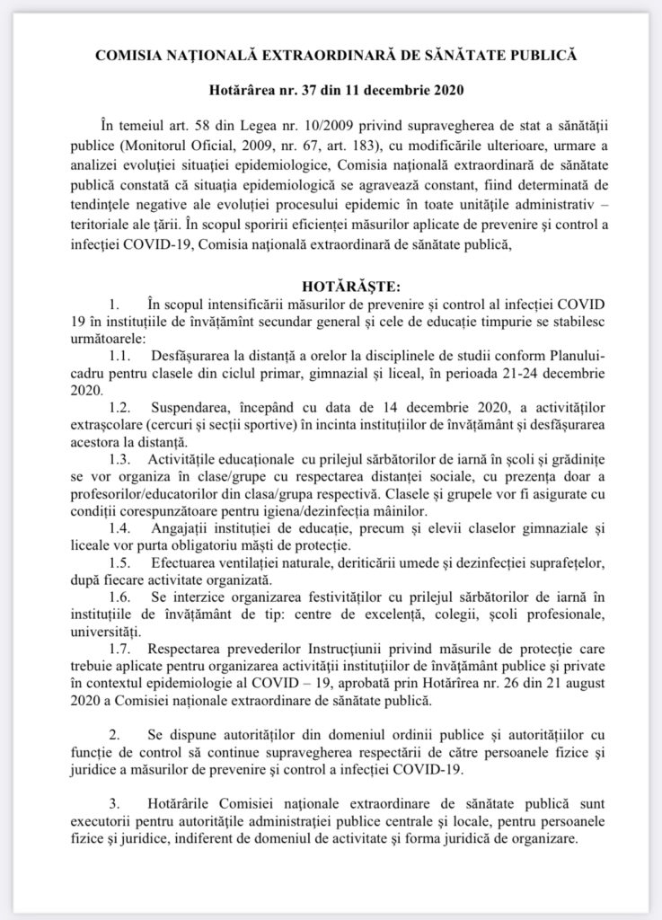 Hotărârea nr. 37 din 11 decembrie 2020 a Comisiei Naționale pentru Sănătate Publică poate fi găsită aici.
