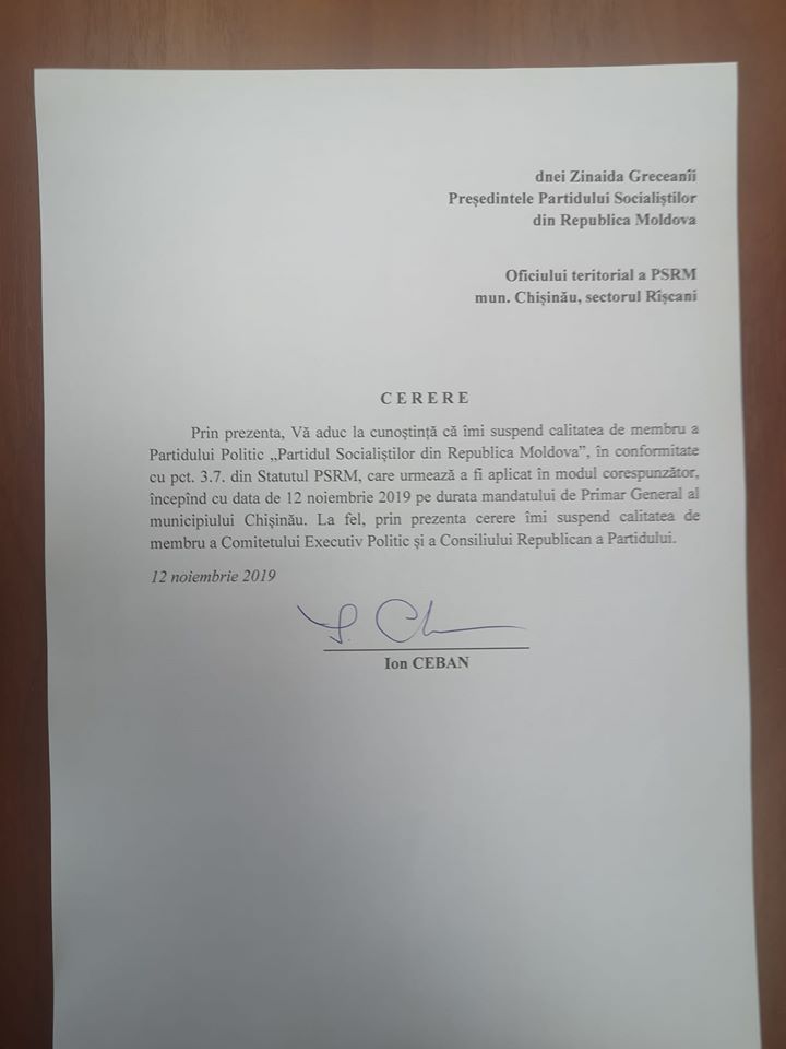 După cum a promis în timpul campaniei electorale că-și va suspenda calitatea de membru al PSRM, Ceban astăzi, a și semnat în acest sens o cerere către președintele PSRM, Zinaida Greceanîi.