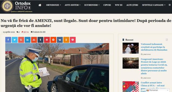 Un exemplu dat este articolul: ‘Nu vă fie frică de amenzi, sunt ilegale. Sunt doar pentru intimidare! După perioada de urgenţă ele vor fi anulate!”, publicat în data de 25.04.2020, prin intermediul căruia, potrivit aprecierilor GCS, „se promovează ideea că cele peste 200.000 de amenzi au fost aplicate ilegal şi vor fi anulate după ieşirea din starea de urgenţă. Populaţia este încurajată să circule fără declaraţia pe proprie răspundere necesară părăsirii domiciliului, întrucât în situaţia în care vor fi amendaţi vor avea câştig de cauză, chiar în instanţă.