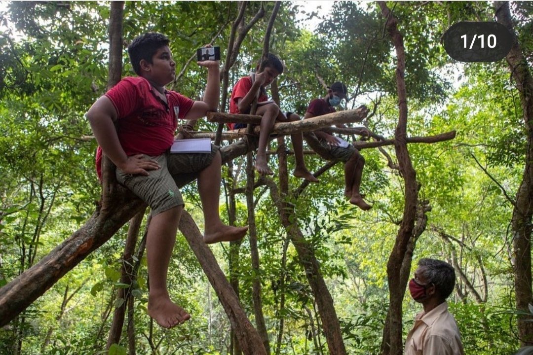 În satul Lunugala, la aproximativ 60 de kilometri distanță de Bohitiwaya, părinții își duc copiii la școală online pe munte, în vârful unor copaci, la peste 9 metri înălțime, pentru că doar acolo ajunge semnalul de internet.