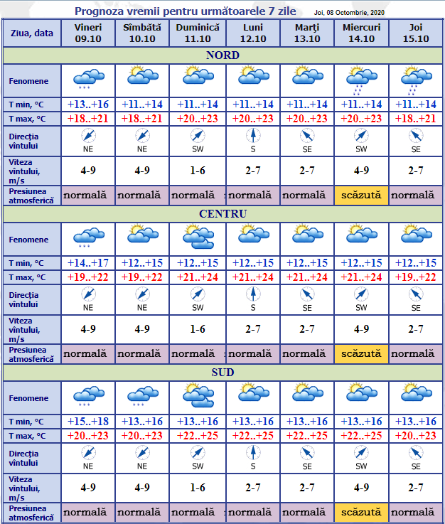 Presiunea atmosferică va fi normală. Vântul va sufla din direcția nord-est, cu o viteză de 4-9 metri pe secundă.