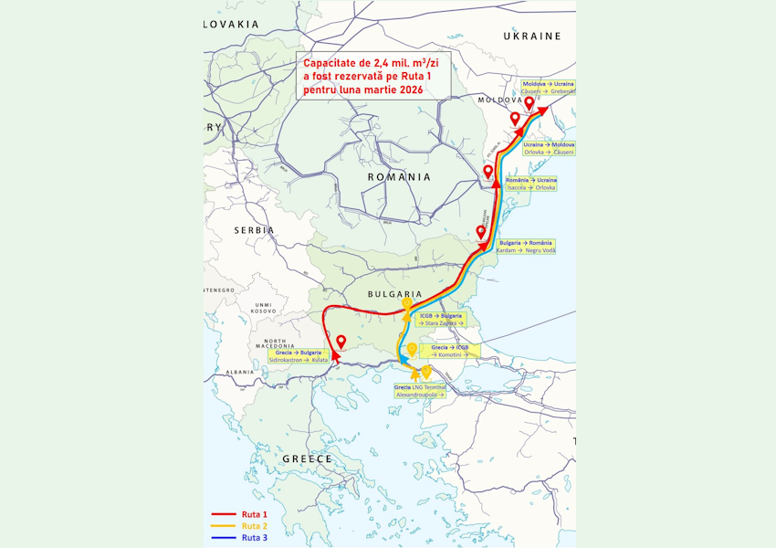 A fost rezervată o capacitate de 25 500 MWh pe zi pe gazoductul Trans-Balcanic, în regim revers fizic, pe Ruta 1 a Coridorului Vertical, în cadrul licitației pentru luna martie 2026.
