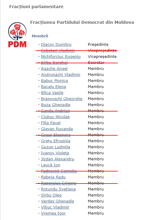 Potrivit informațiilor publicate de Parlamentul Republicii Moldova, fracțiunea PDM este constituită 29 de deputați. Astfel, după plecarea grupului lui Plahotniuc, fracțiunea democrată va rămâne cu cel mult 23 de deputați, în frunte cu Dumitru Diacov și Pavel Filip.