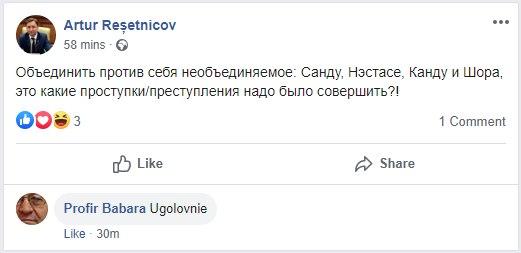 Într-o postare pe Facebook, Reșetnicov a scris: ”Să unești împotriva ta ceea ce nu poate fi unit: Sandu, Năstase, Candu și Șor, pentru ce păcate se putea întâmpla asta?”