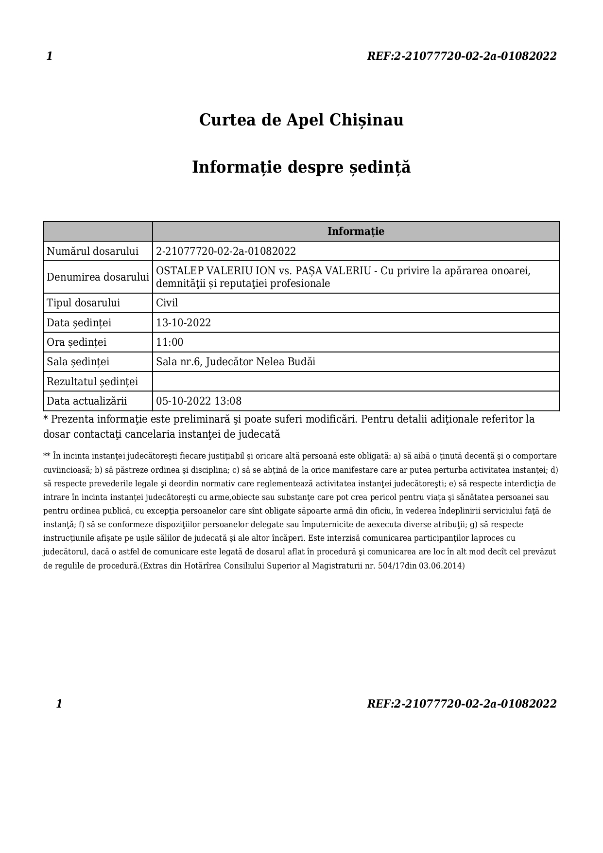 Astfel, prin hotărârea nr.2-12506/2021 din 31 mai 2022, Judecătoriei Chișinău, sediul Centru ”a constatat ca fiind false informațiile defăimătoare răspândite în privința lui Ostalep Valeriu prin mesaje verbale difuzate de Pașa Valeriu pe data de 05.04.2021 (ora 21.44 – la 1 h 29 min.) în cadrul emisiunii televizate ”Ora Expertizei” canalul de televiziune ”Jurnal TV””.