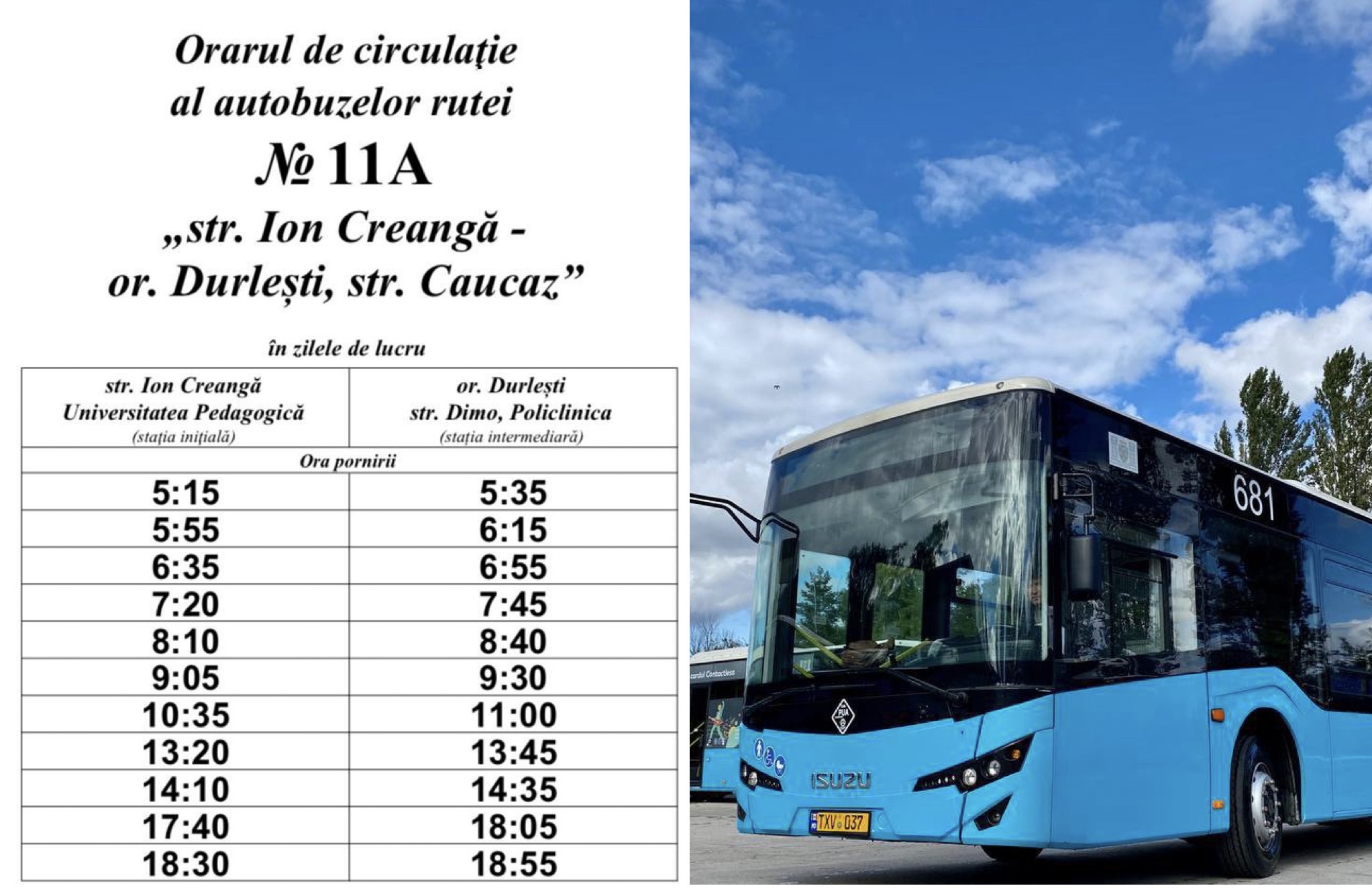 Începând cu data de 04.09.2023, se instituie ruta suburbană de autobuz nr. 11A „str. Ion Creangă – str. Caucaz, or. Durlești”.