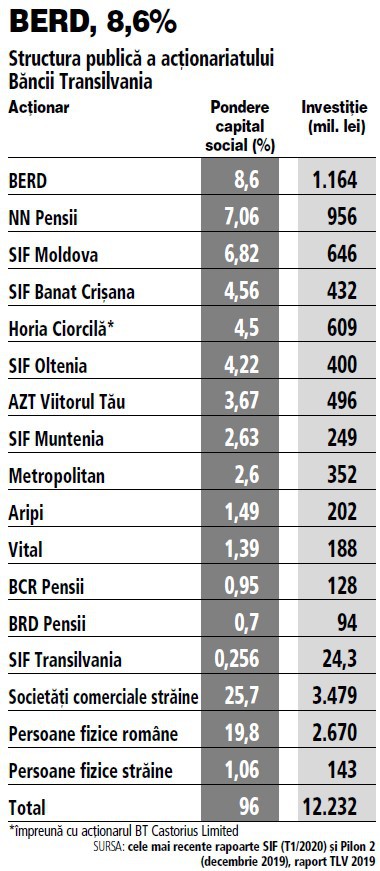 Cel mai mare investitor instituţional individual rămâne Banca Europeană de Reconstrucţie şi Dezvoltare (BERD), cu un pachet de 8,6%, adică o investiţie de circa 1,2 miliarde de lei la preţurile de la finalul anului 2019. Banca europeană este unul dintre cei mai vechi investitori ai instituţiei de credit de la Cluj şi de asemenea este cel mai mare investitor instituţional din România.