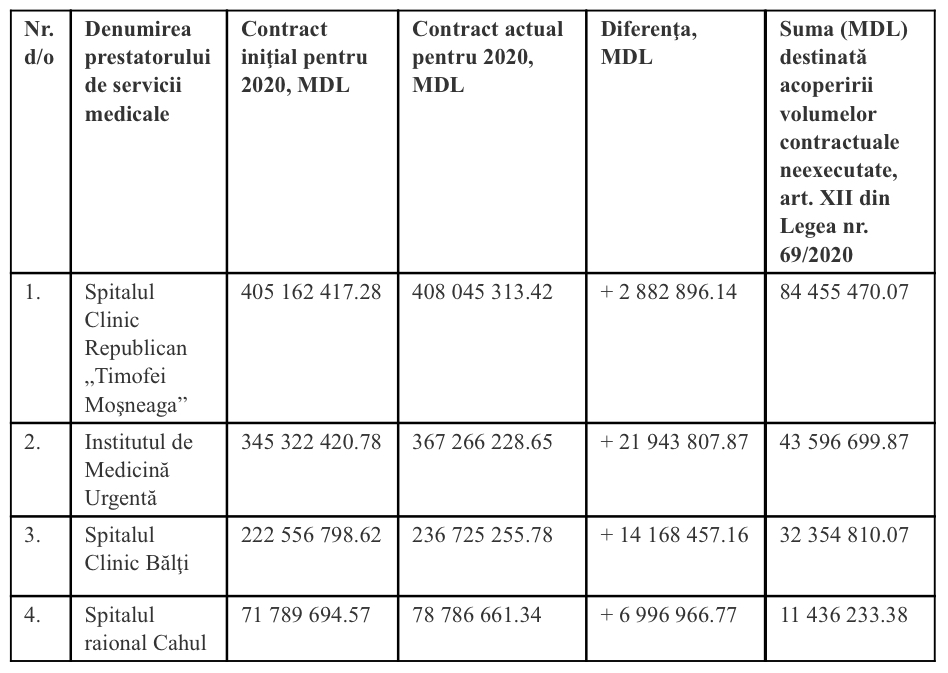 În tabelul de mai jos prezentăm informaţii cu referire la patru instituţii spitaliceşti privind valoarea contractului semnat la începutul anului, valoarea contractului şi a acordurilor adiţionale încheiate până în prezent, diferenţa dintre contractul semnat iniţial şi cel actual.