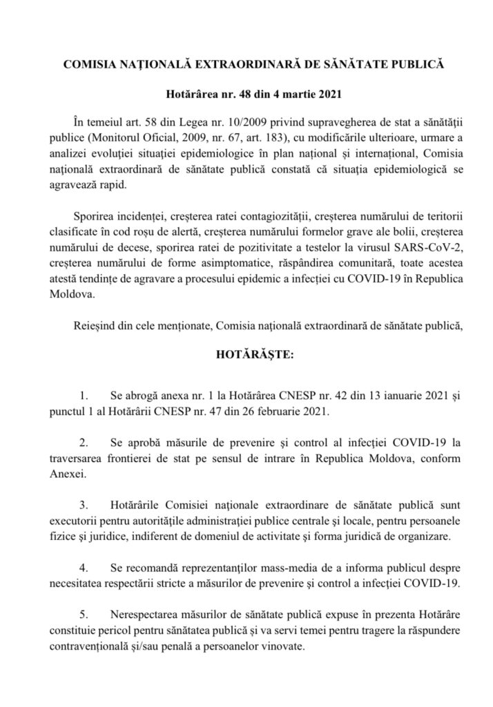 Poliţia de Frontieră informează cetăţenii despre ultimele modificări stipulate în Hotărârea CNESP nr.48 din 4 martie 2021 cu privire la regulile de intrare în Republica Moldova, atât pentru conaţionali cât şi pentru cetăţenii străini. Noile reguli intră în vigoare de mâine, 05 martie, ora 00:00.