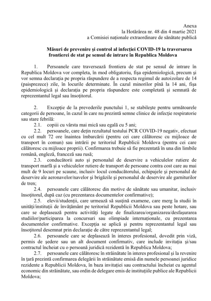 Persoanele care traversează frontiera de stat pe sensul de intrare în Republica Moldova vor completa, în mod obligatoriu, fişa epidemiologică, precum şi vor semna declaraţia pe propria răspundere de a respecta regimul de autoizolare de 14 (paisprezece) zile, în locurile determinate. În cazul minorilor până la 14 ani, fişa epidemiologică şi declaraţia pe propria răspundere este completată şi semnată de reprezentantul legal sau însoţitorul.