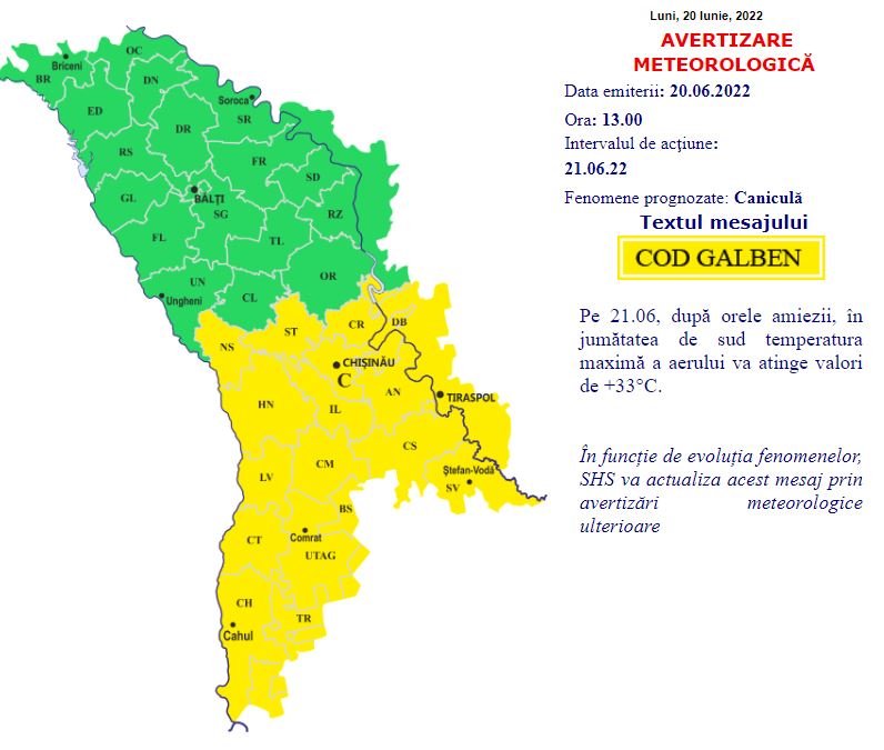 Specialiștii Serviciului Hidrometeorologic de Stat (SHS) au emis o alertă de cod galben de caniculă în zona de sud a Republicii Moldova, inclusiv Chișinău. Mai exact, mâine, 21 iunie, după orele amiezii, în jumătatea de sud, temperatura maximă a aerului va atinge valori de +33°C, informează TV8.md