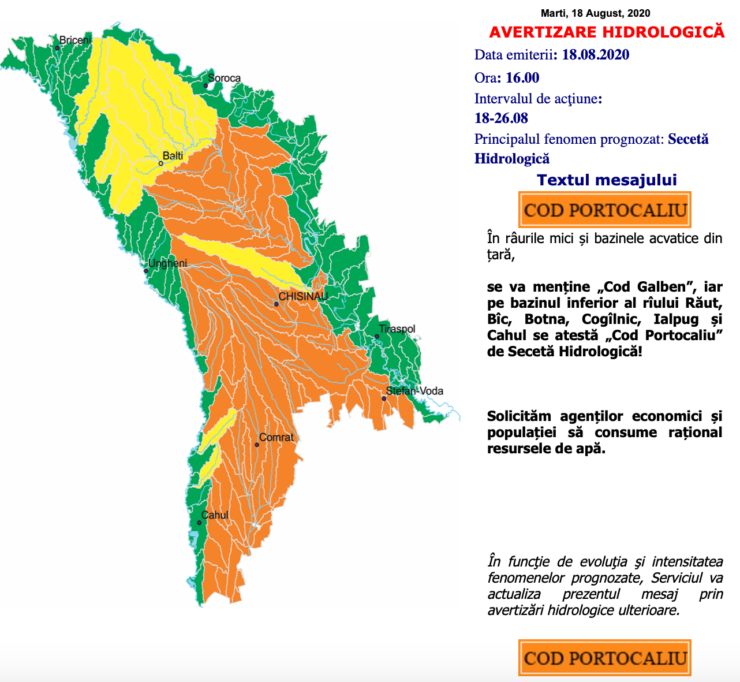 Potrivit specialiștilot, în râurile mici și bazinele acvatice din țară, se va menține cod galben, iar pe bazinul inferior al râului Răut, Bâc, Botna, Cogâlnic, Ialpug și Cahul se atestă cod portocaliu de secetă hidrologică.