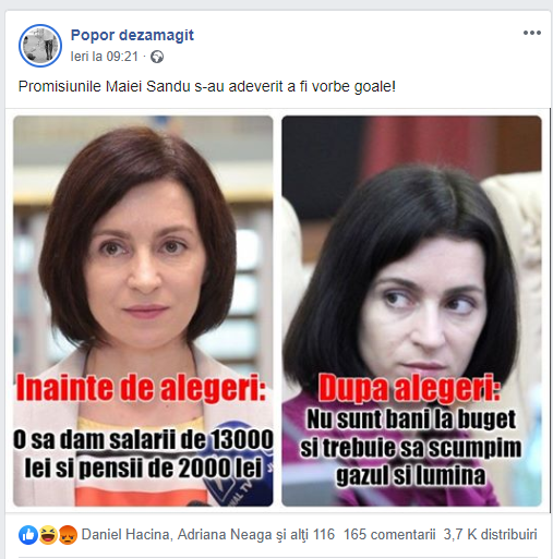 Un colaj cu Maia Sandu postat marți pe pagina de facebook „Popor dezamăgit” a fost distribuit deja de peste 3.700 de internauți. În cele două imagini alăturate se spune că înainte de alegeri lidera PAS promitea moldovenilor salarii de până la 13 mii de lei și pensii de 2 mii de lei, iar după ce a devenit premierul Republicii Moldova, doamna Maia Sandu spune că nu sunt bani în buget de aceea trebuie de scumpit serviciile comunale.