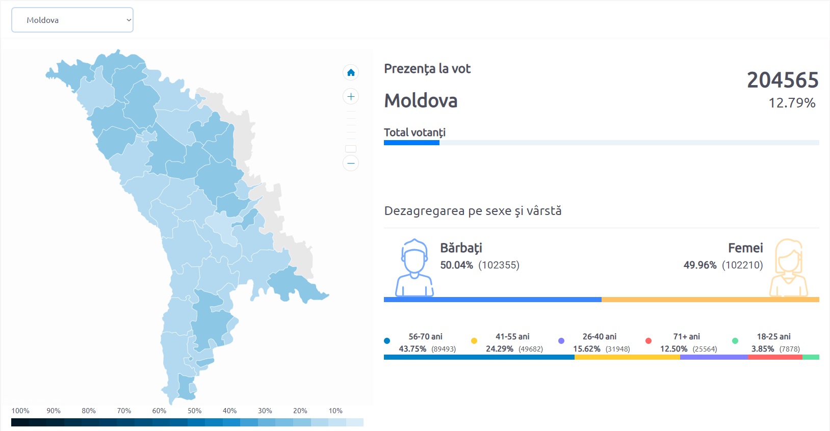 În municipiul Chișinău, la această oră s-au prezentat în jur de 10 %, fiind înregistrată la această oră, ca cea mai mică prezență la vot pe țară.