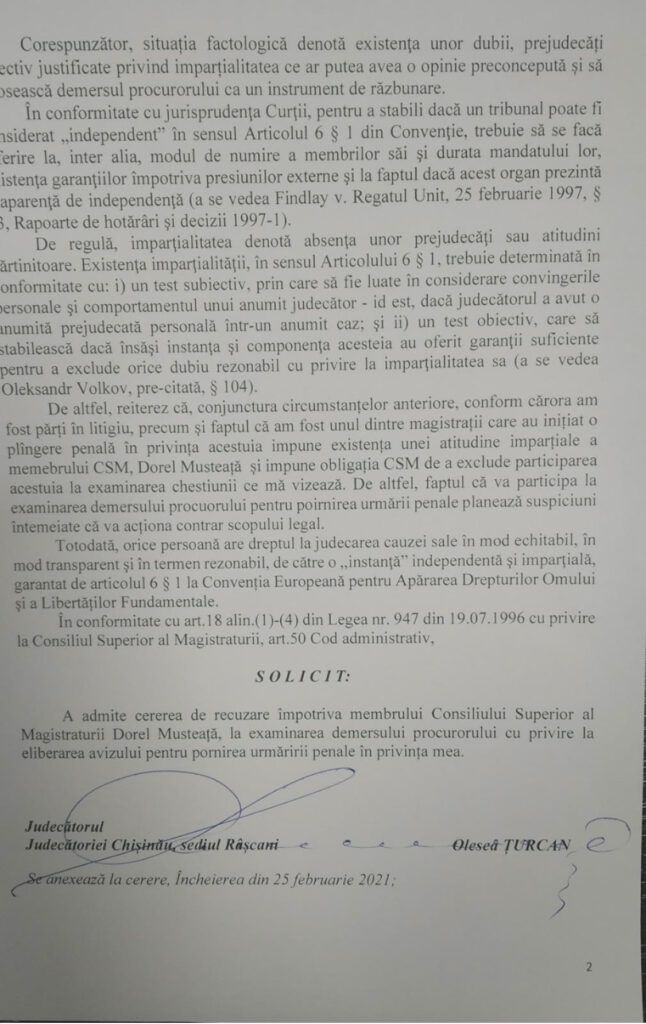 În altă ordine de idei, prin răspunsul 22-299/20-1160 din 04.12.2020, Procuratura Republicii Moldova a examinat deja solicitarea de a verifica legalitatea acțiunilor judecătorului Țurcan Olesea, cu încadrarea acestora în baza art.307 din Codul penal fiind refuzată primirea din lipsa temeiurilor rezonabile privind comiterea infracțiunii respective.