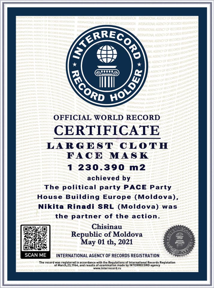 Partidul Acasă Construim Europa a adus Republica Moldova în Cartea Recordurilor. Simbolul speranței a fost, în ultimii ani, masca medicală. Acum Moldova este recunoscută în toată lumea ca și țara care a creat cea mai mare mască de pe glob, datorită PACE.