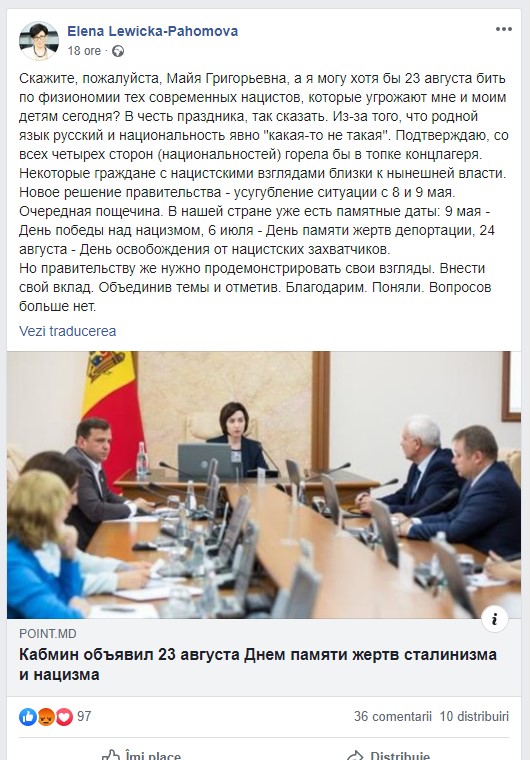 Președinta comisiei pentru mass-media și comunicare din cadrul Consiliului societății civile de pe lângă președintele R. Moldova, Elena Lewicka-Pahomova, critică decizia premierului Maia Sandu privind comemorarea, la 23 august, a victimelor stalinismului și nazismului, ca în spațiul Uniunii Europene.