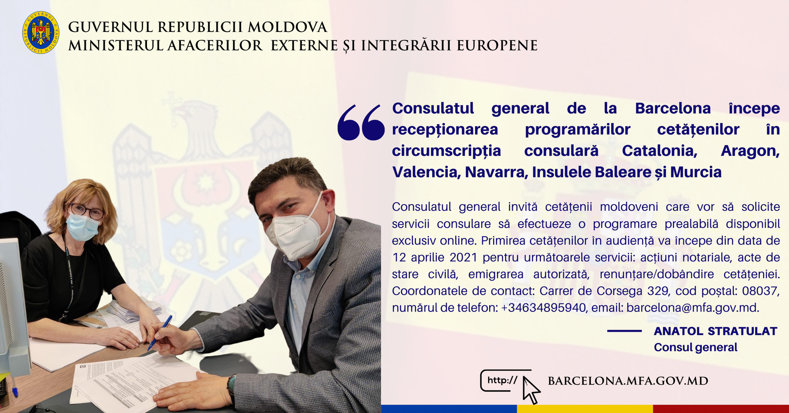 Consulatul general de la Barcelona începe recepționarea programărilor cetățenilor moldoveni în circumscripția consulară Catalonia, Aragon, Valencia, Navarra, Insulele Baleare și Murcia