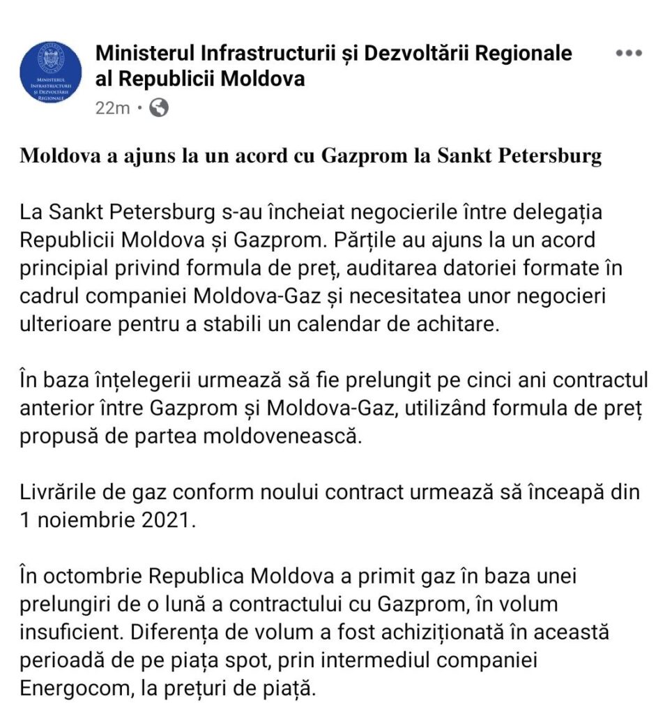 Contractul anterior între Gazprom și Moldova-Gaz urmează a fi prelungit pe cinci ani, utilizând formula de preț propusă de partea moldovenească. Livrările de gaz conform noului contract urmează să înceapă din 1 noiembrie 2021. La această înțelegere s-a ajuns în urma negocierilor dintre delegația Republicii Moldova și Gazprom, de la Sankt Petersbug, anunță Ministerul Infrastructurii și Dezvoltării Regionale, citat de IPN.