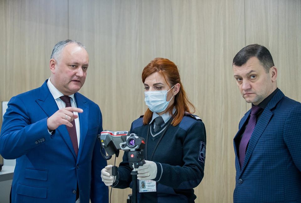 Împreună cu ministrul Afacerilor Interne, Pavel Voicu, a fost inspectatăzona de acces în țară din Aeroportul Internațional Chișinău. Dodon spune că Aeroportul funcționează în regim normal, toți angajații lucrează cu măști și mănuși, iar pasagerii care sosesc, le este măsurată temperatura cu termo-scannerul.