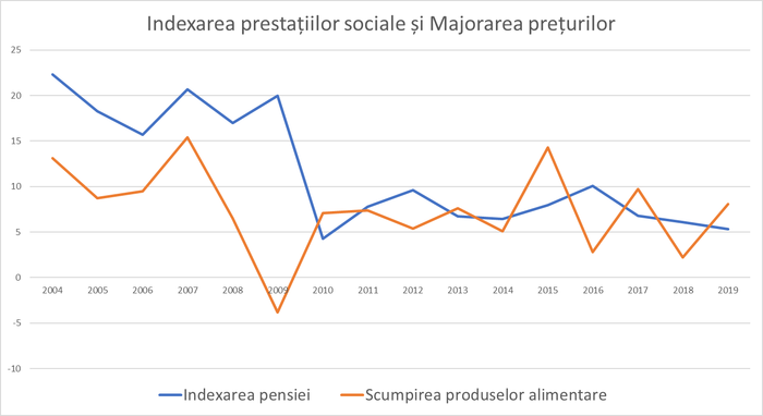 Din grafic observăm că în ultimii 10 ani în 5 ani de zile prețurile la produsele alimentare au crescut mai mult decât indexarea pensiei. în 10 ani de zile pensia în valoare nominală s-a dublat, dar și produsele alimentare s-au dublat. Deci pensionarii, chiar dacă au în prezent o pensie de 2 ori mai mare decât în 2009 totuși ei pot cumpăra aceeași cantitate de produse alimentare ca acum 10 ani în urmă.