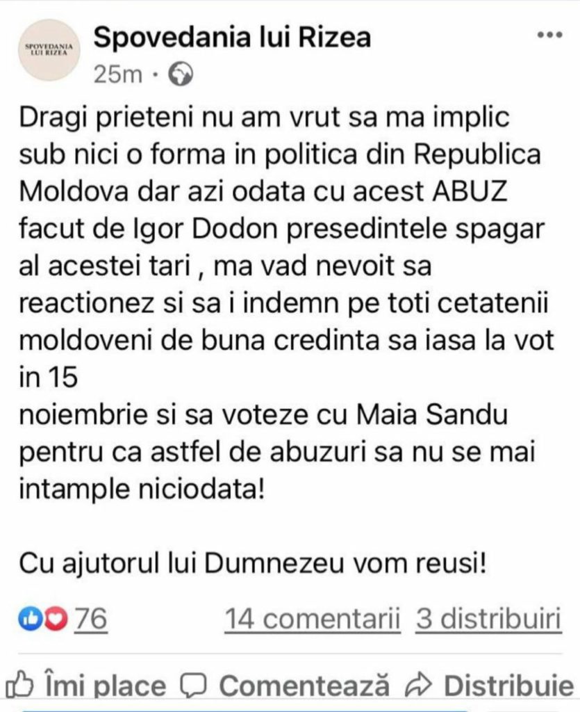 „Dragi Români infractorii pe care îi devoalez au plătit milioane de euro mafiei politice din Moldova condusă de Igor Dodon si Vladimir Plahotniuc pentru a îmi retrage în mod abuziv cetățenia Republicii Moldova! Mă voi lupta în instanță aici la Chișinău și sper cu ajutorul vostru și al lui Dumnezeu să pot reuși! Adevărul învinge întotdeauna!”, a scris Cristian Rizea pe Facebook.