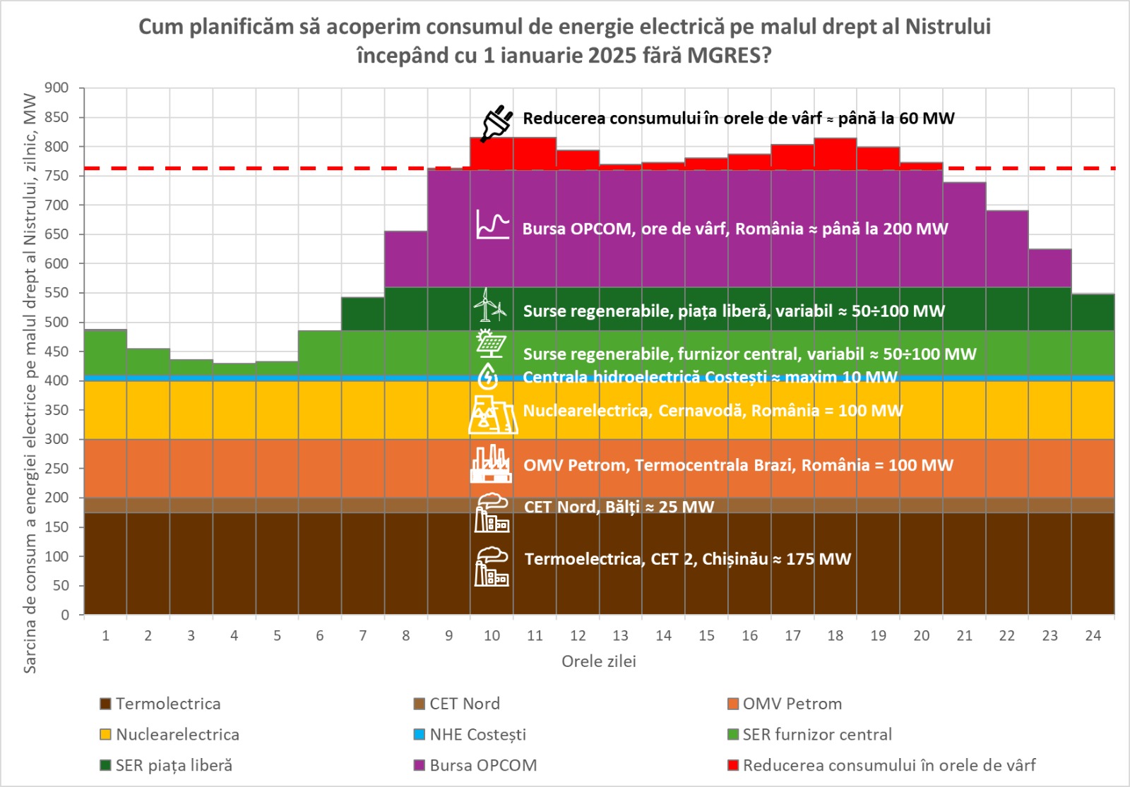 Pentru a garanta livrarea de energie electrică fără întreruperi pe malul drept al Nistrului este necesar de acoperit sarcina de consum care iarna atinge valori de până la 850 MW în orele de vârf, vedeți graficul atașat.