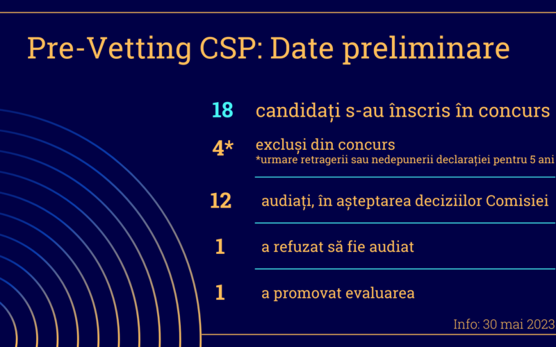 Comisia Pre-Vetting a încheiat cea de a doua și ultima rundă de audieri publice a candidaților la funcția de membru în Consiliul Superior al Procurorilor (CSP). Cinci candidați procurori și o reprezentantă a societății civile au participat la interviul public pentru a clarifica unele aspecte relevante procesului de evaluare.