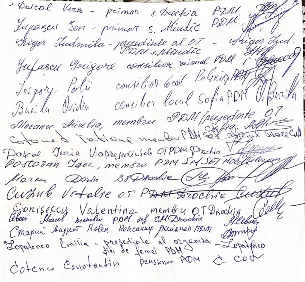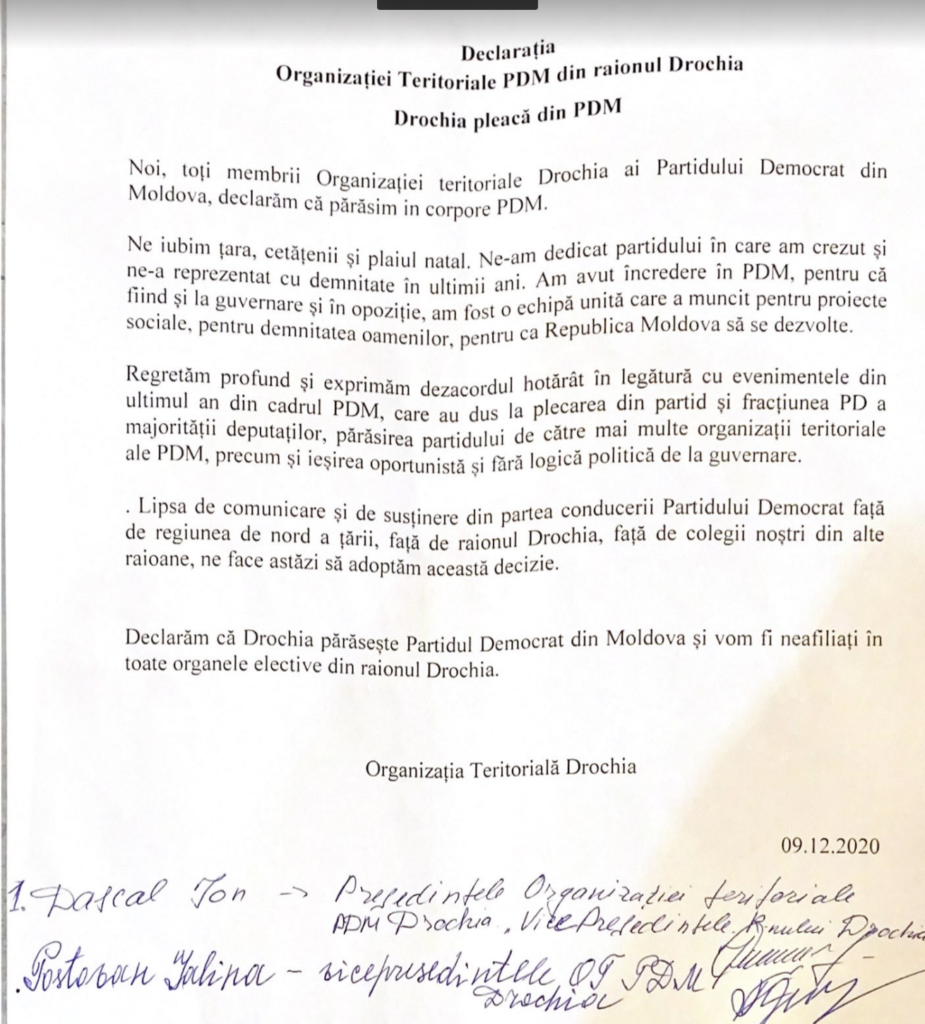 „Vă aducem la cunoștință decizia Organizației raionale de partid Drochia a PDM de ieșire din rîndurile partidului democrat. Decizie susținută în corpore de conducerea organizației, președintele și vicepreședinții, președinții organizațiilor de tineret, femei și veterani, precum și de liderii organizațiilor primare, primari și consilieri raionali aleși pe listele PDM.
